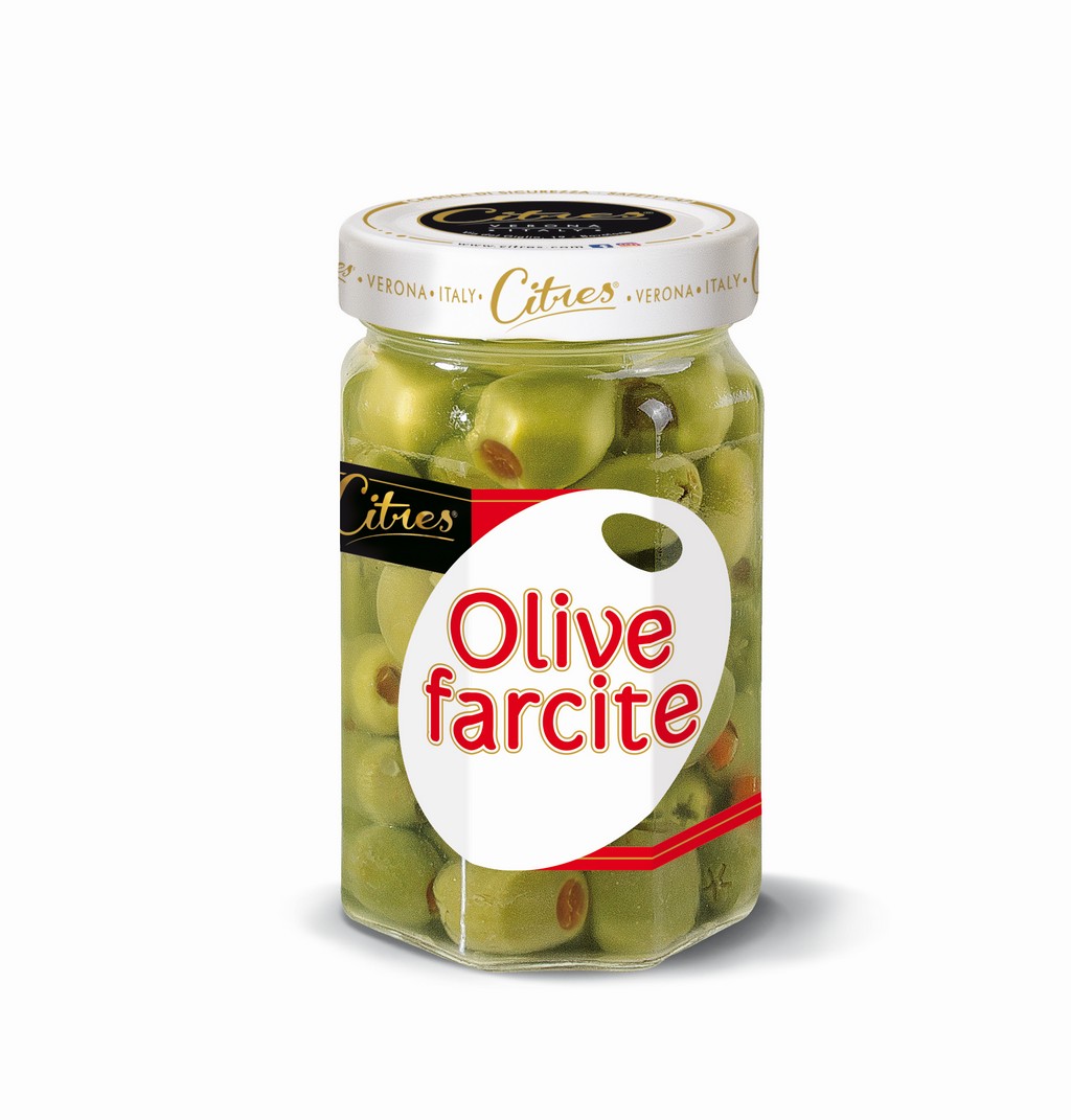 Olive farcite provenienza Grecia o Spagna, farcite con pasta di peperone.